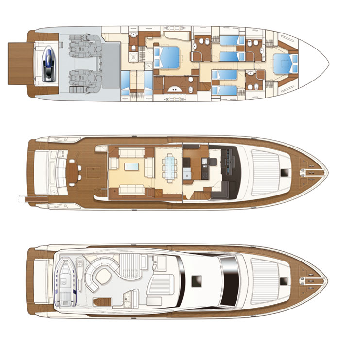 - Flybridge: Features a spacious flybridge with ample seating and sunbathing areas.